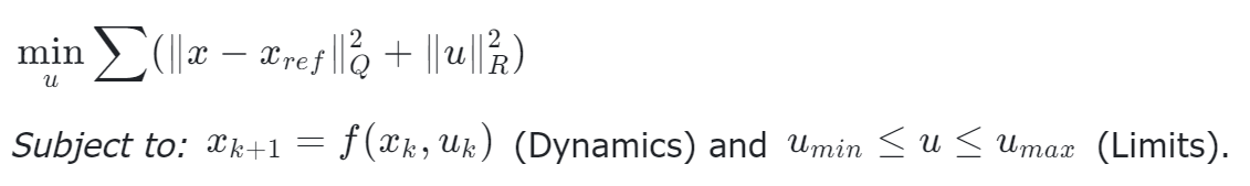The killer feature of MPC is handling Constraints natively (e.g., “don’t hit the wall” or “limit voltage to 5V”). We solve for control input u to minimize the cost J: